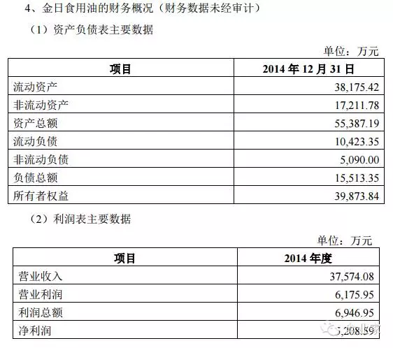 公告中称,河南鹿邑县金日食用油有限公司控股股东,董事长兼总经理朱杰先生作出业绩承诺:标的公司 2015 年和 2016 年实现的净利润(扣除非经常性 损益)分别为 5,500 万元和 6,800 万元,若各年度未能实现前述净利润的,则由朱杰先生向本公司作出相应的补偿。