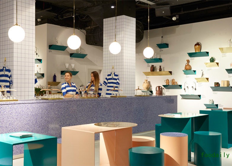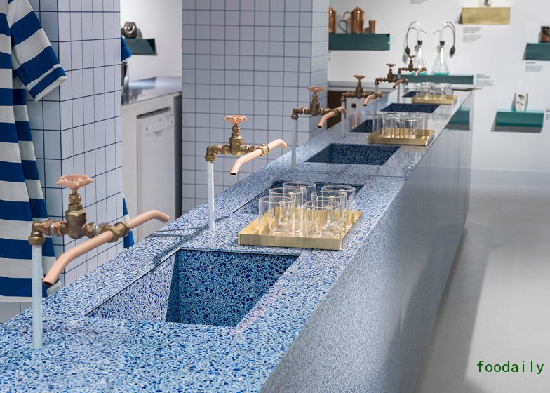 意大利设计工作室 Arabeschi di Latte 操刀展内饮水吧的设计。吧台由混合了可回收玻璃及环氧树脂的水磨石材料制成,表面光亮并带有蓝色的几何碎片图案;取水处的水龙头和管道则以铜为主材料,样式复古。有意思的是,连在吧台工作的店员都穿上了蓝白相间的海魂衫。