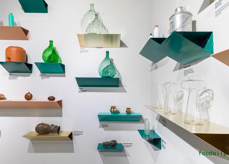 吧台上供顾客使用的饮水杯以及墙上置物架上陈列的容器,形状各不相同,材质也多种多样,从陶瓷到玻璃都有,意在提醒前来观展和休息的人们:除了用(一次性)塑料水瓶做容器,你还有很多其他的选择。