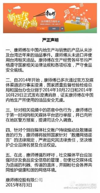 近日,一段两分多钟的视频短片在网络上快速扩散,将康师傅再度推上了食品安全问题的风口浪尖。日前,针对媒体与公众对油品安全的关注,康师傅正式对外公布了《2013年-2015年康师傅油脂使用状况报告》,详细介绍了康师傅在中国内地生产所用油品的检测结果。康师傅表示,在国内生产所使用的油品均由中粮集团、嘉里集团、双汇集团等国内符合国家相关资质规定的合格供应商提供,并严格遵守食品安全相关的法律法规,从未进口过动物油脂。