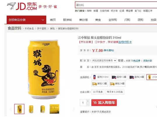 借助江中猴姑的知名度,江中进一步发展食疗业务,上半年推出了功能饮料猴姑饮料和蓝枸饮料。在京东商城,每罐310毫升的猴姑饮料和蓝枸饮料售价均为7元。