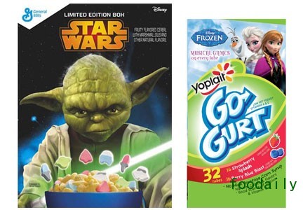 星际大战的卡通形象出现在通用磨坊两款新的产品中。星际大战飞船形状的果味谷物片,塑型成lightsabers, storm troopers, Yoda 和 R2-D2的棉花糖是星际大战主题谷物产品的特色。每份含有9 g糖和10 g全谷物。