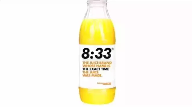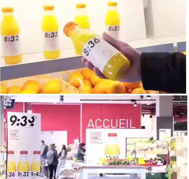 全球每一天都会卖出5.5亿公升的橙汁,其中一半是在欧洲。但最好,最健康的橙汁肯定是鲜榨的。法国一家超市也为大家创造了一个最新鲜的橙汁品牌,品牌的名字里面已经体现其 ”新鲜度”,品牌的名字就是制造果汁的那一时刻,如下图为 8:33,每一瓶果汁的“品牌”名字都会随着生产时间不同而转变,新鲜的果汁就是这样送到店内,然后再到顾客的购物篮里。