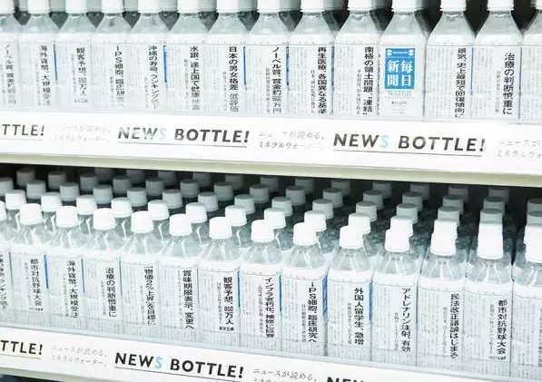 把报纸新闻直接印在矿泉水瓶包装上,这种标签创意灵感来自于日本的每日新闻社。该新闻社调查发现,随着纸媒的逐渐边缘化,每天买报纸的年轻人越来越少。于是他们决定将《每日新闻》印在矿泉水瓶上,这样年轻人看报就多了一种渠道。在销售过程中,这种“新闻瓶”的矿泉水定价也降低了一半。