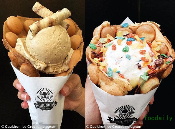 不过,我们今天要说的是,来自香港的鸡蛋仔最近在美国火了。虽然这款被称为“Puffle Cone”的甜点火遍美国西海岸,但目前只有加州一家名字为Cauldron Ice Cream 的冰激凌店有售。这家店的店主 Desiree Lee 是香港人,是他首先把卖相和制作原理与华夫饼相似的鸡蛋仔带到美国,将其当成冰激凌的“外皮”,完成后的样子有点像可丽饼(crepe)。
