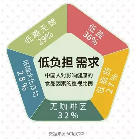 中国人对影响健康的食品因素的重视比例分别为,低盐36%、无咖啡因32%、低糖无糖29%、低碳水化合物28%、低脂肪27%。