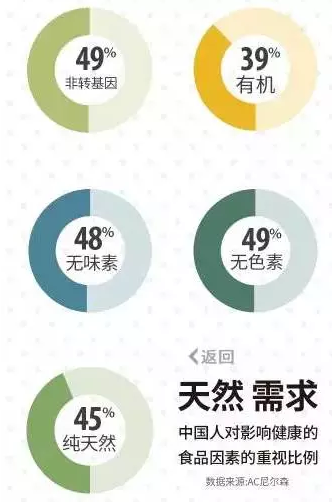 中国人对影响健康的食品因素的重视比例依次为:非转基因49%、无色素49%、无味素48%、纯天然45%、有机39%。