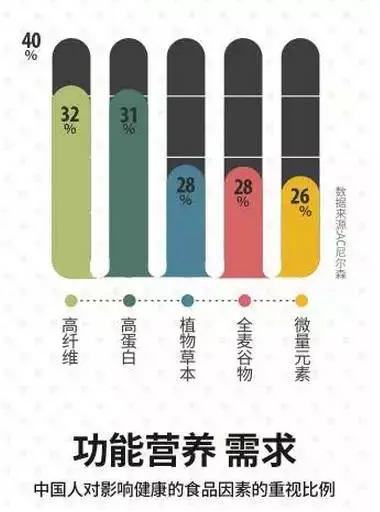 中国人对影响健康的食品因素的重视比例为:高纤维32%、高蛋白31%、植物草本28%、全麦谷物28%、微量元素26%。