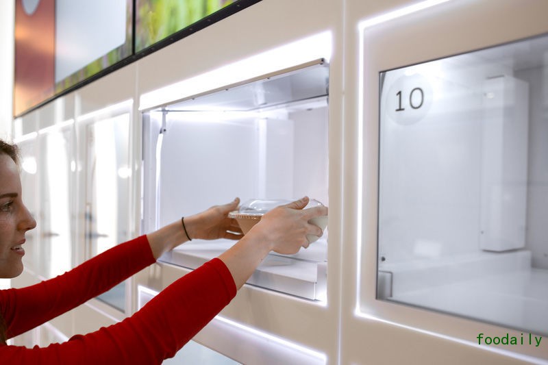 旁边一面墙上则布满装有玻璃门的小格间和一个大屏幕,当一位顾客点的套餐做好之后(嗯,目前厨师还是人类),屏幕会告知他应该在哪一格取餐。玻璃门也是个电子触屏,上面显示取餐信息,顾客直接点击屏幕打开柜门,拿出自己的食物。整个过程颇具未来感。