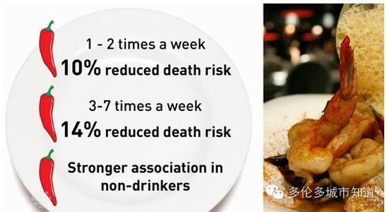该医学论文称,研究人员对50万中国人进行调查发现,每周吃1至2次辛辣食物的人与不吃辣的人相比,整体死亡风险减少10%;每周吃3至7次辛辣食物,死亡概率下降14%。而常吃辣椒的人死于癌症、心脏病和呼吸道疾病的几率也低于不常吃辣的人。