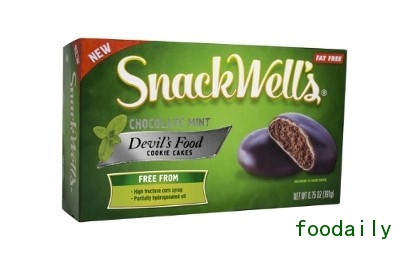 SnackWell巧克力薄荷恶魔曲奇蛋糕是SnackWell经典巧克力恶魔零食的新突破。这款诱人的零食含60卡路里的热量,不含高果糖浆,不含部分氢化油脂,无人工色素和香精。每盒6.75盎司,建议零售价为3.49美元。