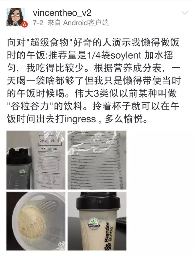 我的一位朋友Vincentheo在美国读生物学博士,熟悉这行当的人都知道,她需要在实验室辛苦工作。实验室繁重的工作下需要省时省力解决吃饭问题,美国大学的食堂又不像国内这么靠得住,平时自带便当的她买来Soylent偶尔解决午饭问题。