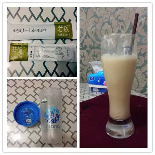左上角的小袋子就是若饭,装着与Soylent类似的粉状代餐。一袋若饭有40克,标准的一顿饭要吃两袋,比较胖的人一次可以吃三袋。其实你计算一下,两袋若饭包括80克不含水分的纯干货,加水喝下去不比三两米饭少。左下角是我老婆购买USANA代餐粉时赠送的摇摇杯,放在瓶盖里的金属球可以帮助搅匀。我对USANA不感冒,认为这是暴利的传销货;我老婆对若饭不感冒,认为我又发神经给不知道给哪儿冒出来的公司当小白鼠。