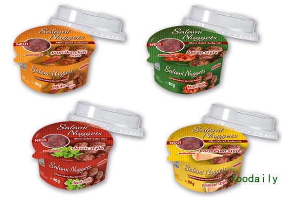 德国Windau股份有限公司推出了Salami Nuggets,一种高蛋白质肉类零食的新概念产品。销售包装为90g/杯的四连杯,这种一口大小的萨拉米片有四种口味:培根,经典,红辣椒和奶酪。