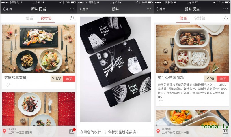 便当由于都是团队事先做好、急速冷却的,因此用户下单后(通过微信和 APP,网站正在改版)即可发出,平均送达时间为 35 分钟,目前覆盖上海 CBD 一带,日订单为 100-200 份,客单价在 30 元左右。在葛伊能看来,新味的模式是以自生产的产品(食材包 + 自制便当)来服务都市人午、晚餐的场景。未来团队计划建立若干个小分仓,覆盖上海中环以内,同时研发早餐产品,变成白领一族三餐的供应商。