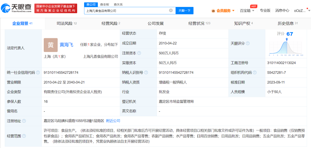 9月18日消息,天眼查资料显示,近日,上海凡香食品有限公司发生工商变更,原股东薛孝文退出,新增盒马旗下上海盒新智造食品科技有限公司为股东并全资持股。上海凡香食品有限公司成立于2010年4月,法定代表人为黄海飞,注册资本500万人民币,经营范围含食品生产、食品销售、食用农产品批发、农副产品销售、日用百货销售等。(来源:电商报)
