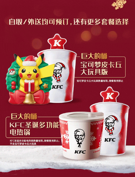 近日,肯德基官宣圣诞季推出三重活动:一是“巨大的桶”,一桶内包含11件单品,同时还有生巧流心脆珠慕斯大蛋糕回归供应;二是宝可梦系列玩具套餐,包括可达鸭、喵喵、卡比兽和超大款皮卡丘;三是购买套餐赠送多功能电热锅,该款电热锅复刻全家桶经典红白造型,一锅兼具煮涮煎多重功能。原文链接
