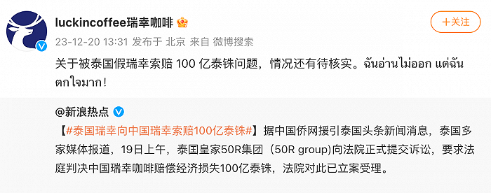 瑞幸咖啡回应遭泰国瑞幸索赔100亿泰铢:情况有待核实