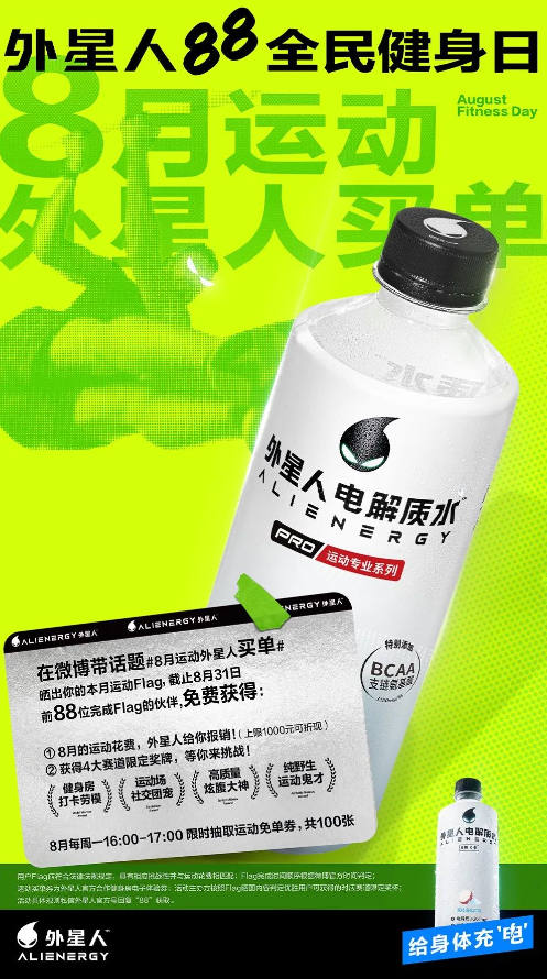 在微博带话题#8月运动外星人买单#,晒出本月运动flag,截止8月31日,前88位完成flag的,可以免费获得报销8月的运动花费(上限1000可折现)和4大赛道限定奖牌。自8月1日起,外星人与北京150+健身房/运动馆合作,来运动可以获得外星人电解质水,10万瓶免费送。原文链接