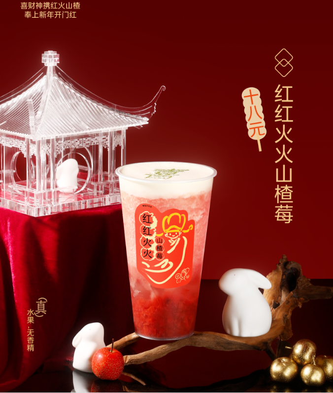 1月6日,喜茶上新一款山楂饮品:红红火火山楂莓。据介绍,新品优选当季山东甜红子山楂,融入绿妍茶汤打制冰沙,经典喜茶芝士铺顶,同时有2023新年限定包装,单杯购买还可获赠喜财神贴纸一张,售价为18元/杯。原文链接