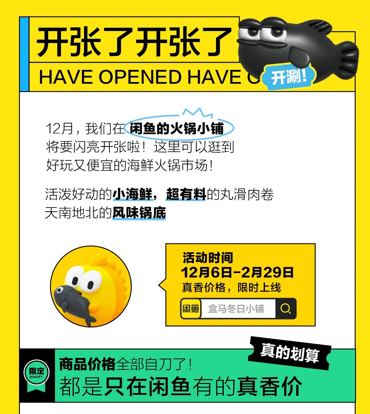 12月6日到2月29日,盒马×闲鱼携手推出「海鲜火锅市场」的活动,在闲鱼搜索「盒马冬日小铺」,商品包括海鲜、丸滑肉卷和锅底,同时还有盒马×闲鱼联名限定款黑鱼片,商品均以“自刀”形式以折扣价呈现。原文链接
