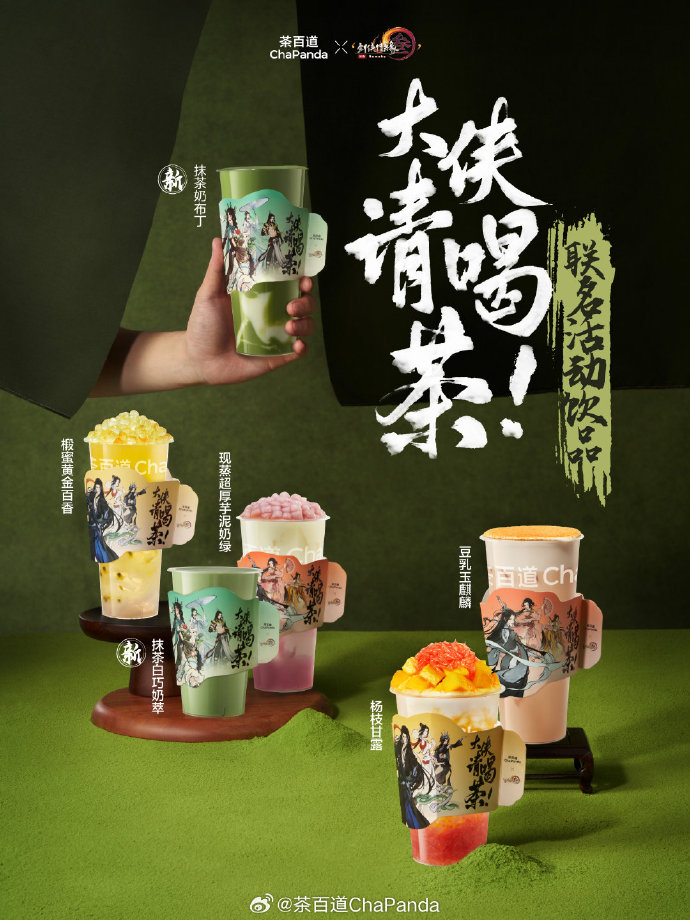 12月15日,茶百道宣布和剑网3的系列联名活动正式面市。本次联名活动有六款产品:抹茶白巧奶萃、抹茶奶布丁、豆乳玉麒麟、杨枝甘露、现蒸超厚芋泥奶绿、椴蜜黄金百香。 联名周百年包括联名杯套、联名贴纸、联名摇摇乐盲袋和主题店活动。原文链接