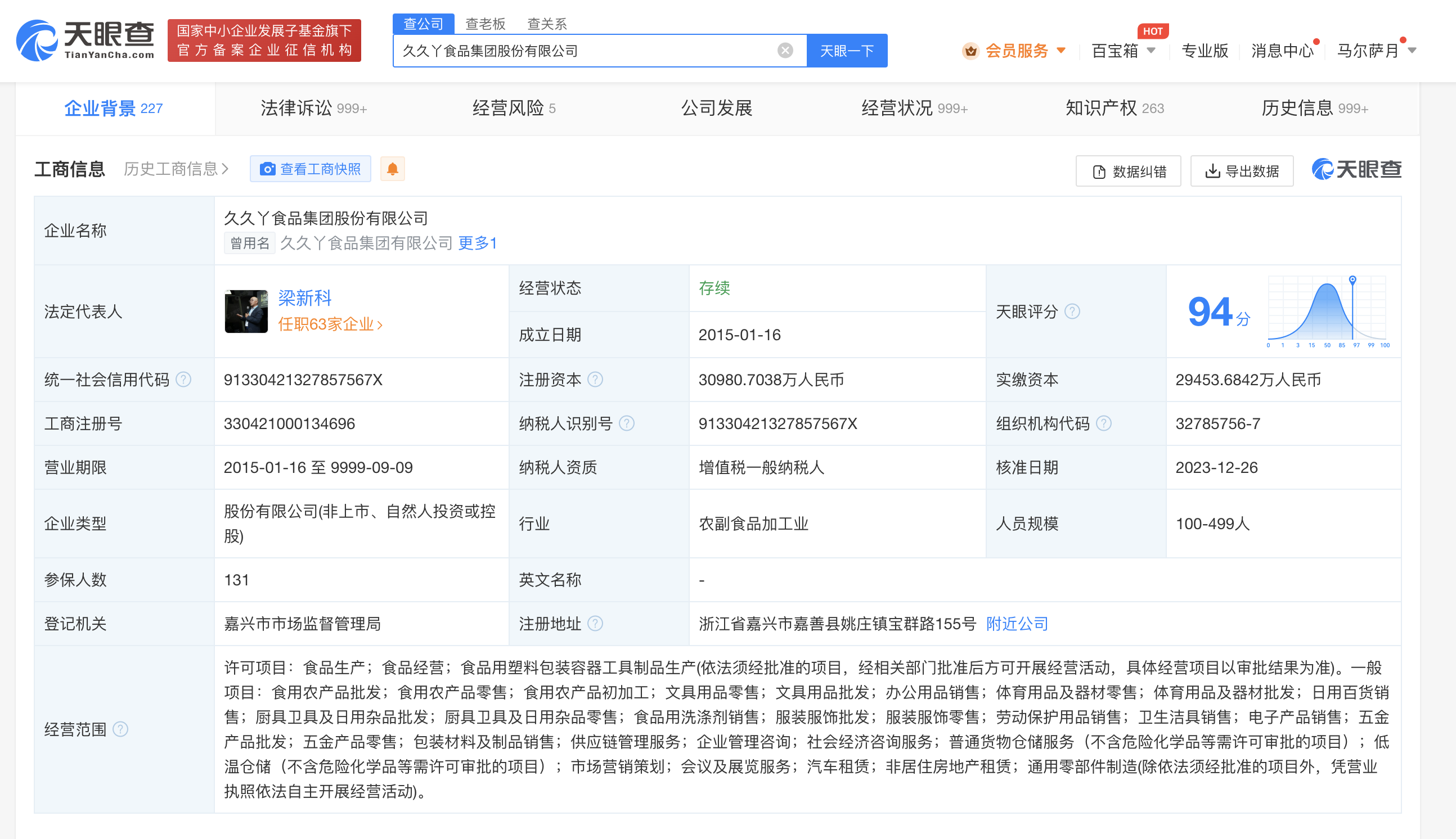 天眼查App显示,近日,久久丫食品集团有限公司发生多项工商变更,公司名称变更为久久丫食品集团股份有限公司,市场主体类型由有限责任公司(自然人投资或控股)变更为股份有限公司(非上市、自然人投资或控股),同时,多名主要人员发生变更。 该公司成立于2015年1月,法定代表人、董事长为梁新科,注册资本约3.1亿人民币,由共青城红创投资合伙企业(有限合伙)、梁新科、王军等共同持股。原文链接