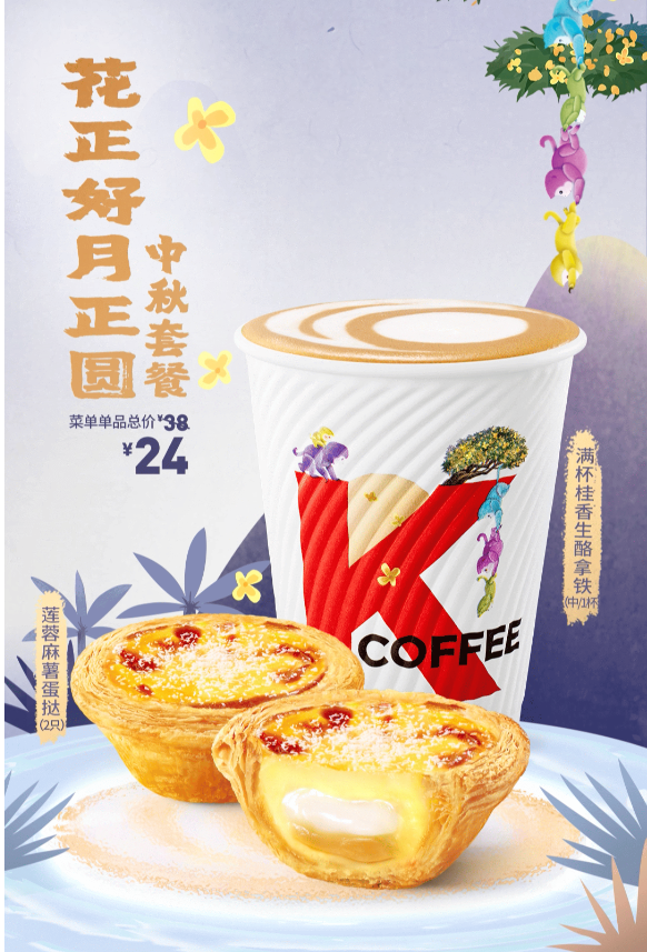 近日,KFC×上美影推出花正好月正圆中秋套餐,包含满杯桂香生酪拿铁(中杯)和两只莲蓉麻薯蛋挞,满杯桂香生酪拿铁(中杯)售价22元,莲蓉麻薯蛋挞售价9元/只,套餐价格24元。原文链接