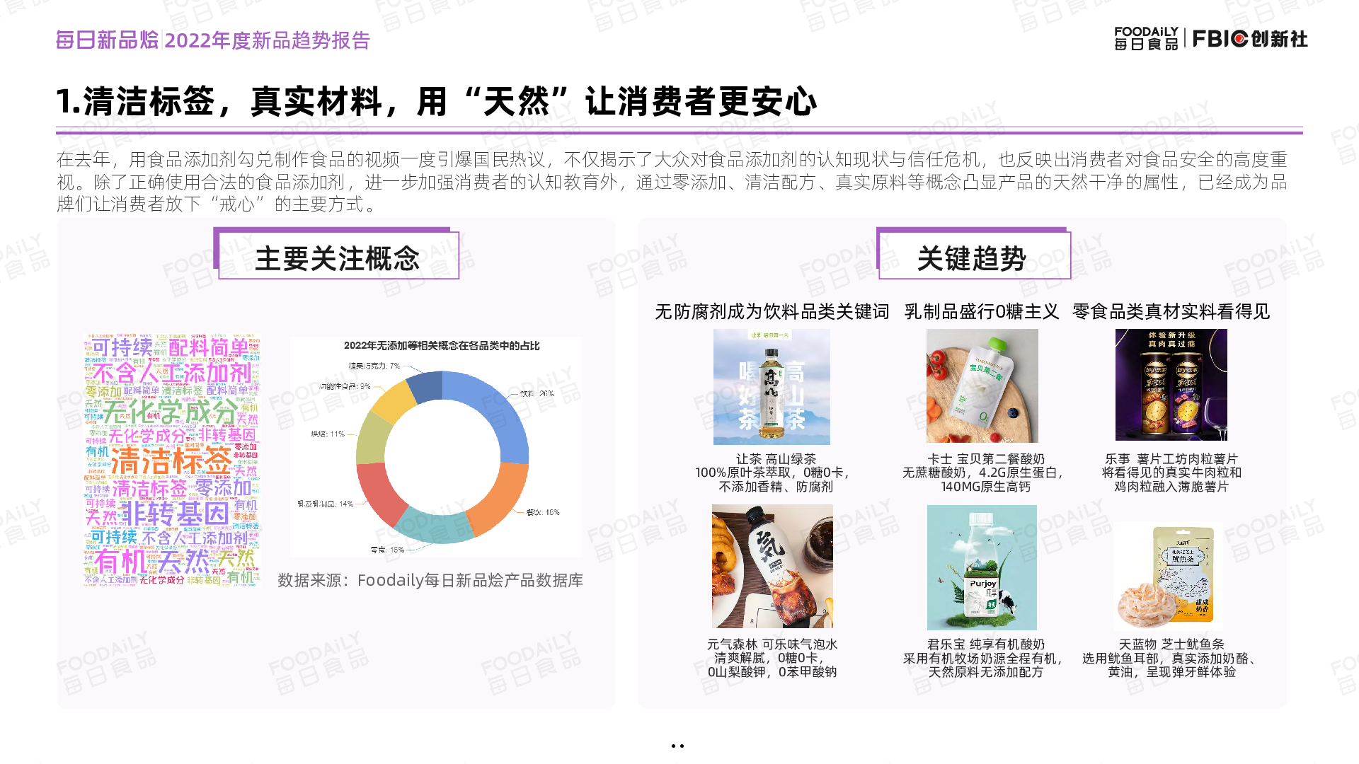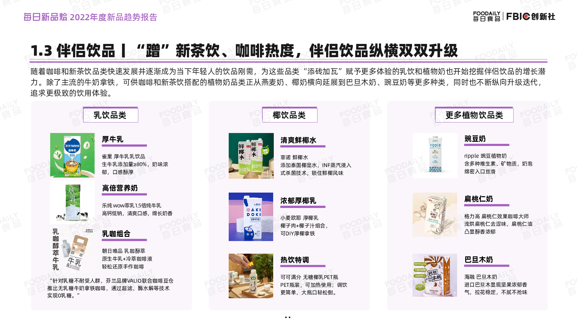 依托食品饮料上新平台「每日新品烩」收录的2000+sku国内新品,FBIC创新社(Foodaily旗下聚焦产品创新账号)从食材、配方、技术等行业创新趋势,以及饮料、乳及乳制品、零食、烘焙、功能性食品、餐饮及糖果巧克力7大品类创新趋势总结提炼出以下趋势重点,帮助把握2023产品创新脉搏。