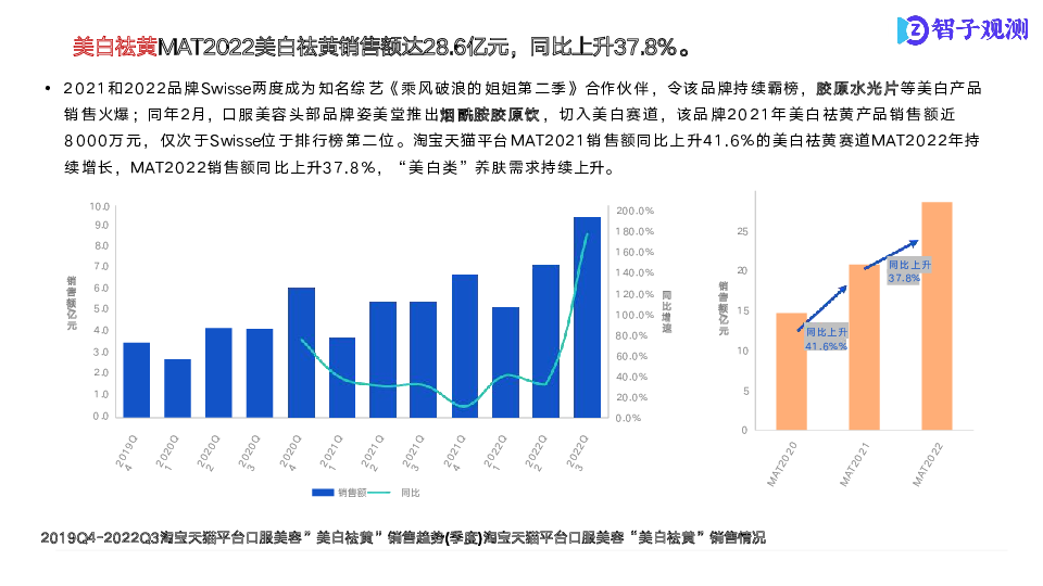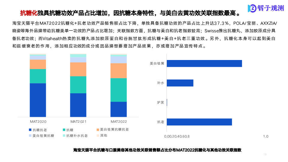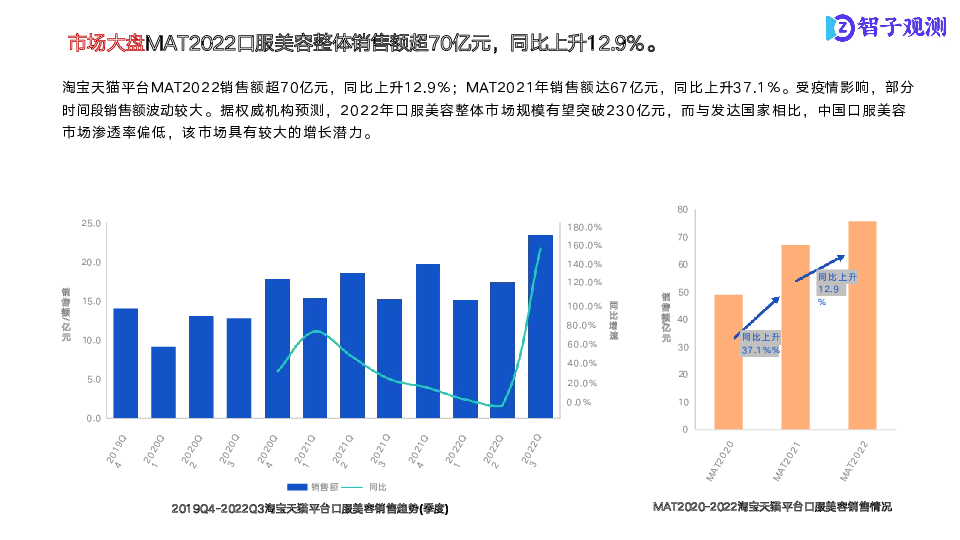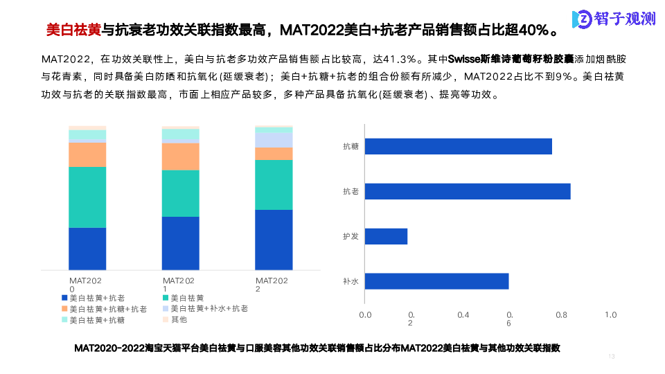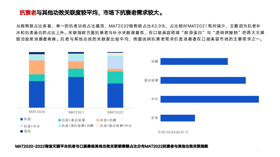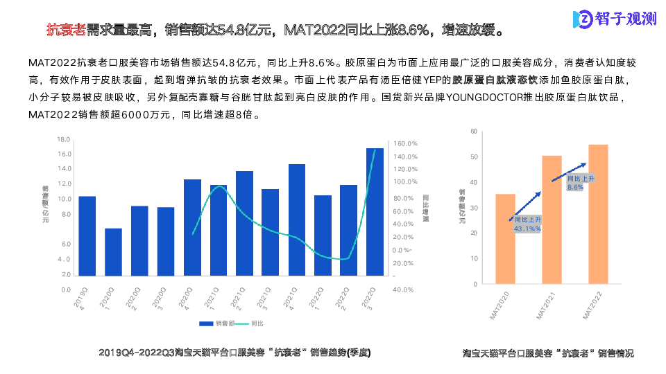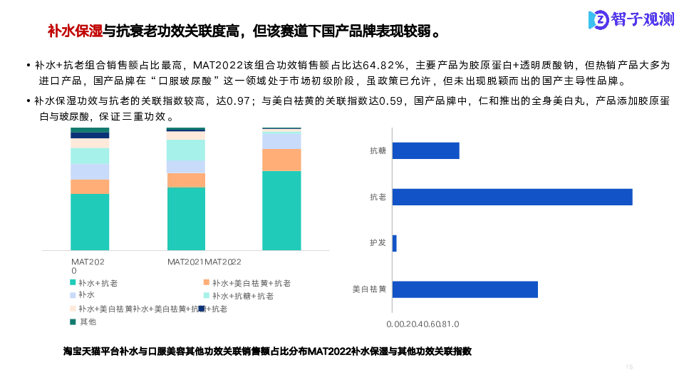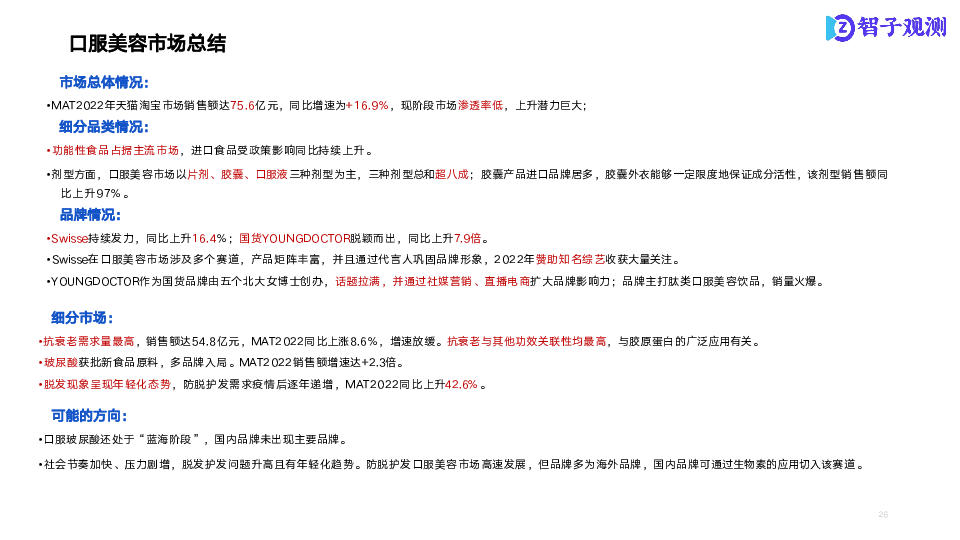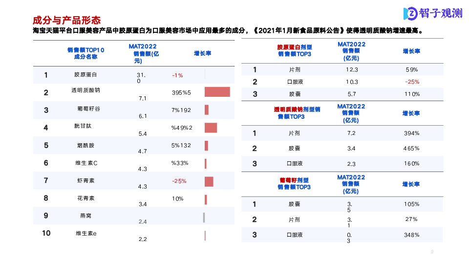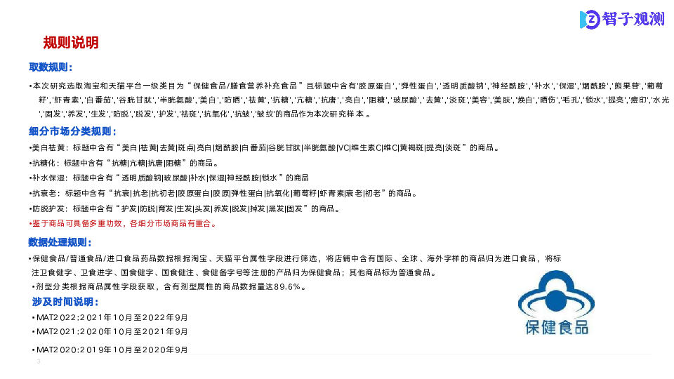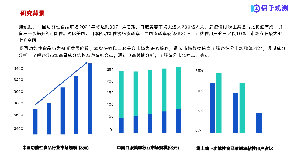本次研究以口服美容市场为研究核心,通过市场数据信息了解各细分市场整体状况;通过成分分析,了解各分市场商品成分结构及潜在机会点;通过电商舆情分析,了解细分市场痛点、亮点。
