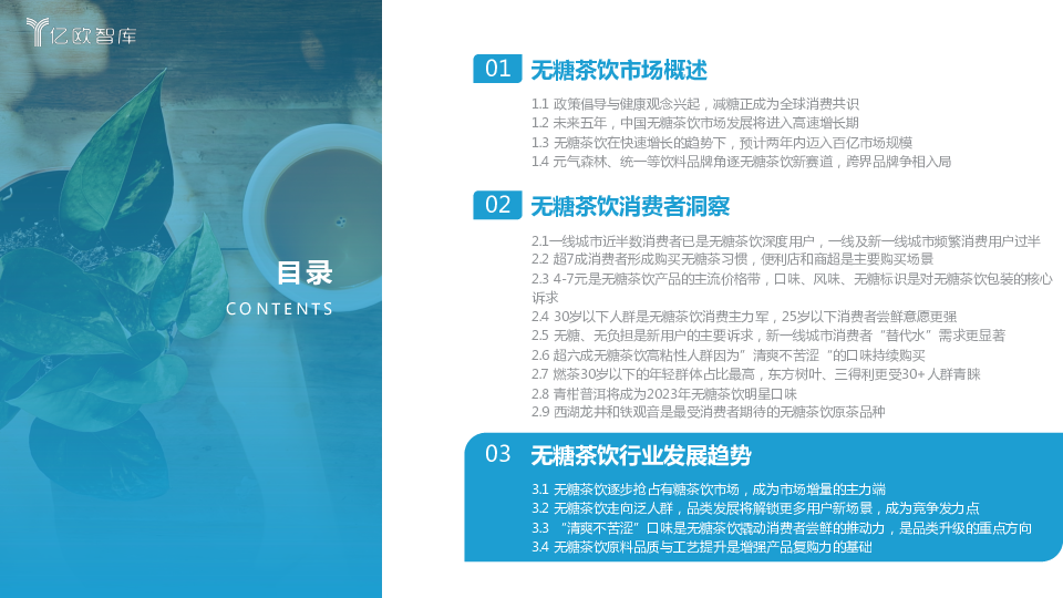 01. 无糖茶饮市场概述 02. 无糖茶饮消费者洞察 03. 无糖茶饮行业发展趋势