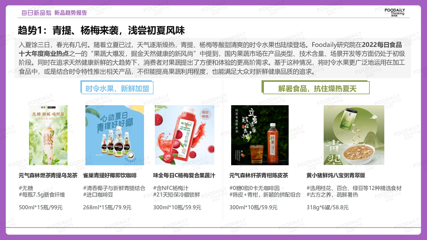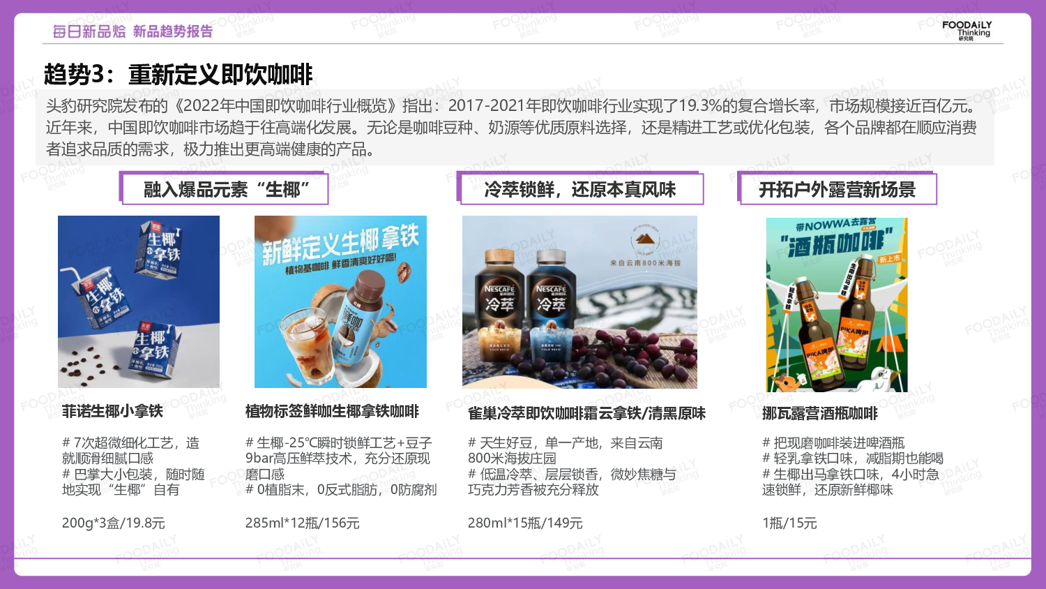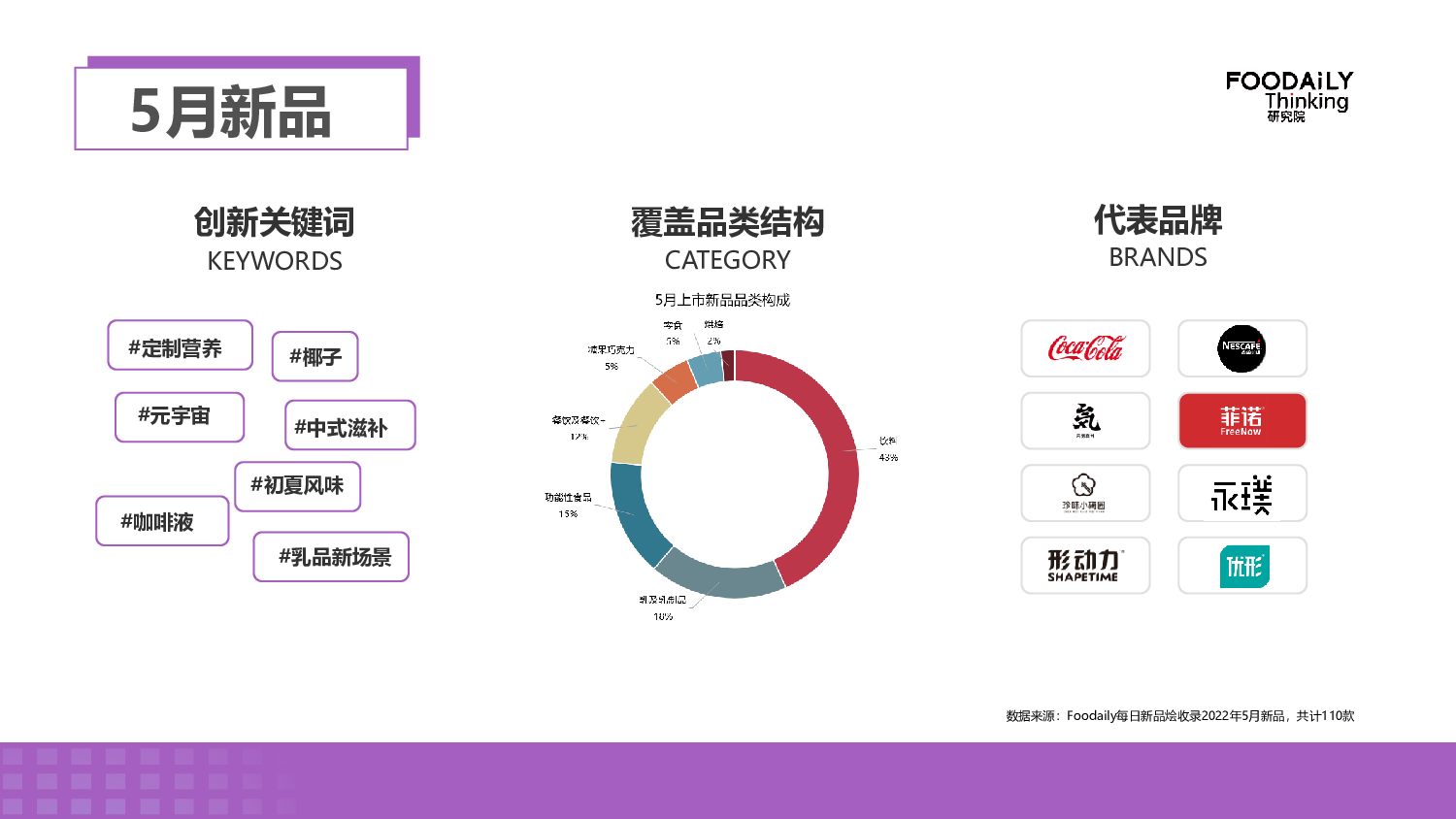 「每日新品烩」新品趋势报告是Foodaily研究院基于全球创新产品研究特别策划的趋势分析报告,总结不同市场产品创新趋势,为本土新品开发提供有价值的灵感参考。 本次报告的产品数据选取于Foodaily专为国内食品饮料企业打造的新品发布平台「每日新品烩」收录的公开新品数据。本次共筛选了新品发布时间范围在2022年5月的共计110款新品,覆盖饮料、乳及乳制品、零食、烘焙、功能性食品、餐饮及糖果巧克力7大品类。