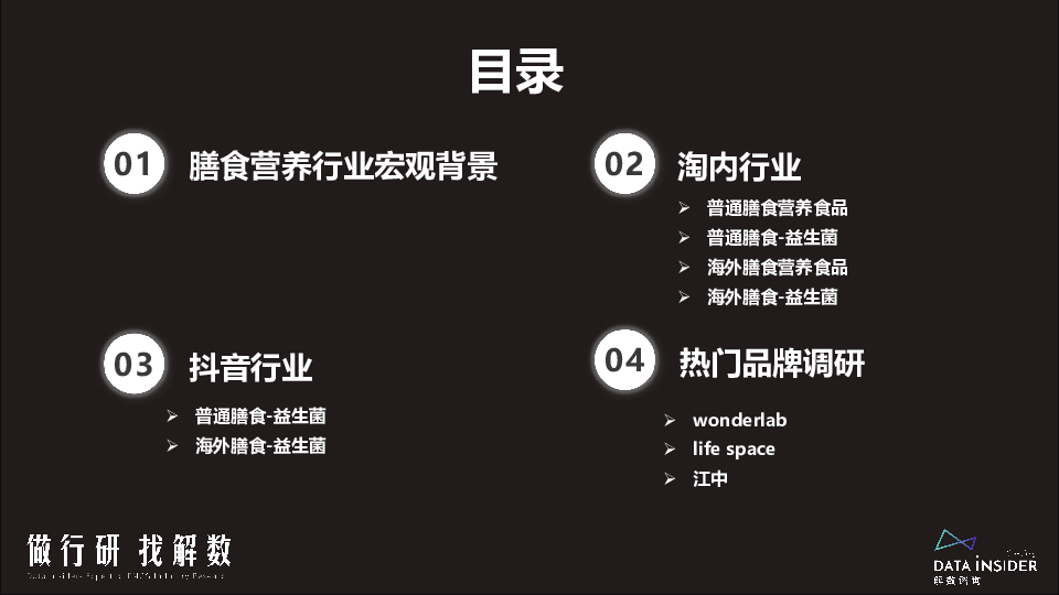 1. 膳食营养行业宏观背景 2. 淘内行业 3. 抖音行业 4. 热门品牌调研