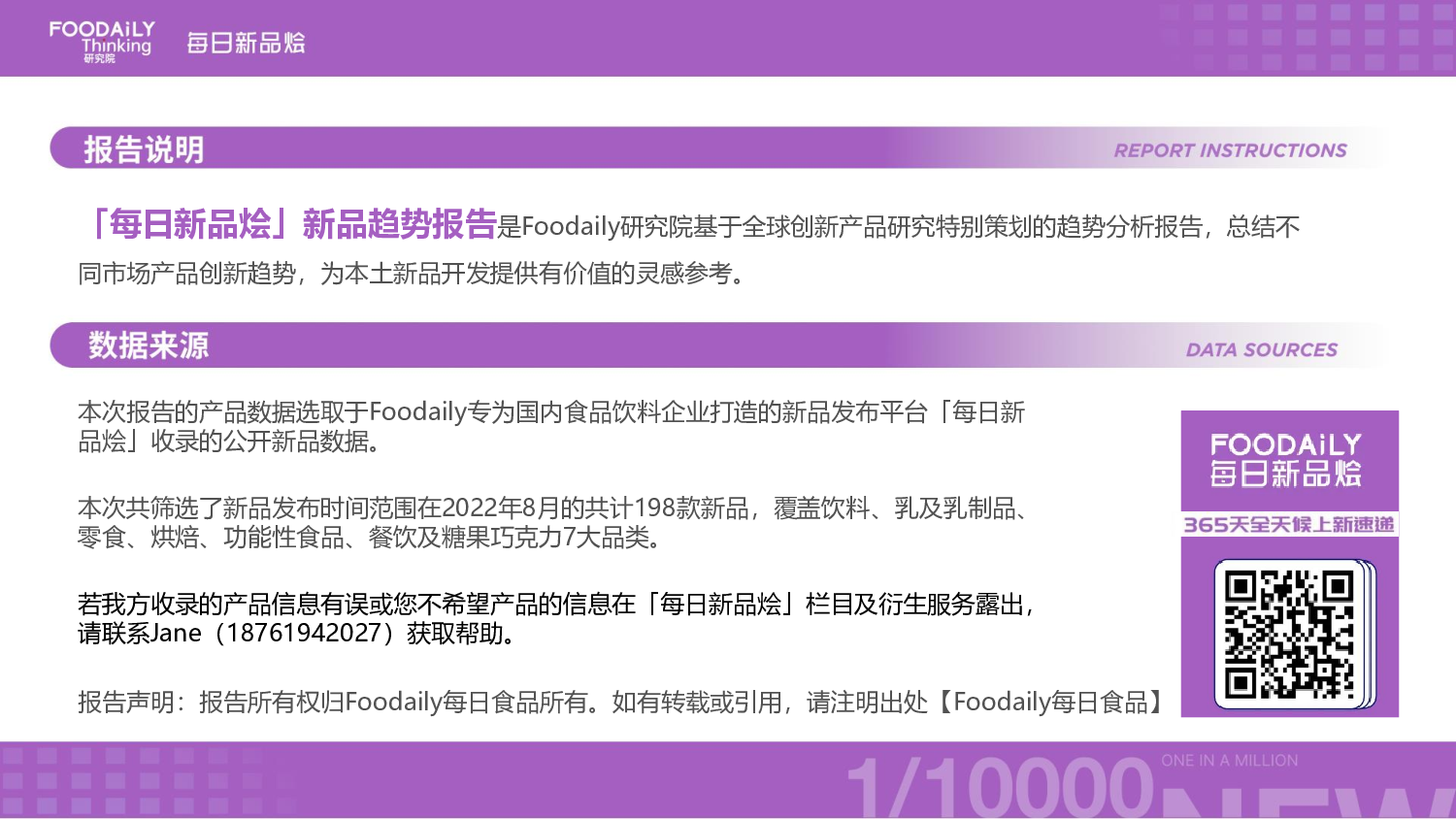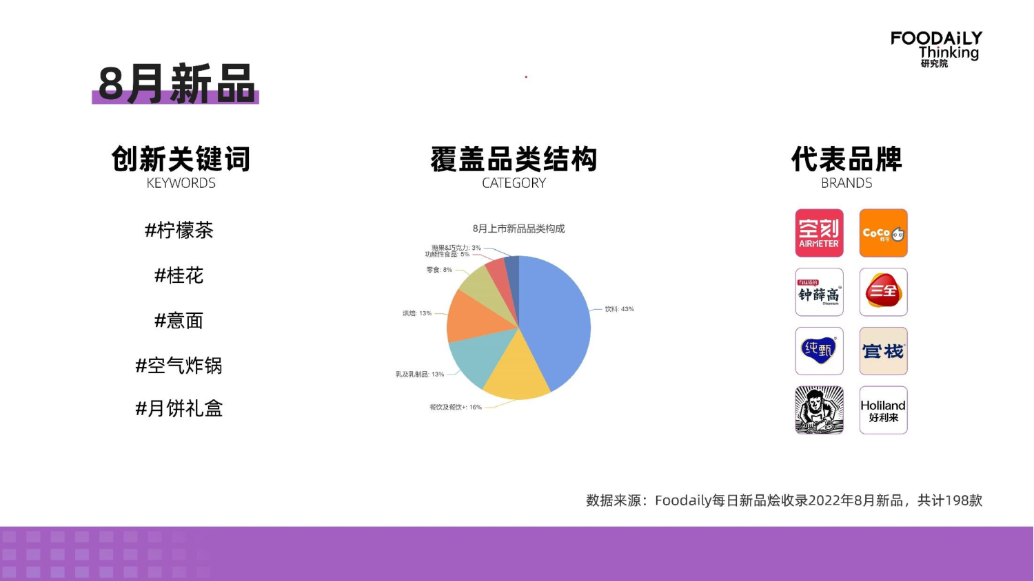 本次报告的产品数据选取于Foodaily专为国内食品饮料企业打造的新品发布平台「每日新品烩」收录的公开新品数据。 本次共筛选了新品发布时间范围在2022年8月的共计198款新品,覆盖饮料、乳及乳制品、零食、烘焙、功能性食品、餐饮及糖果巧克力7大品类。