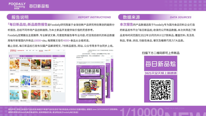 本次报告的产品数据选取于Foodaily专为国内食品饮料企业打造的新品发布平台「每日新品烩」收录的公开新品数据。在以往报告对月度趋势进行概括分析的基础上,10月报告新增了重点产品解读的部分。 本次共筛选了新品发布时间范围在2022年10月的共计227款新品,覆盖饮料、乳及乳制品、零食、烘焙、功能性食品、餐饮及糖果巧克力7大品类。